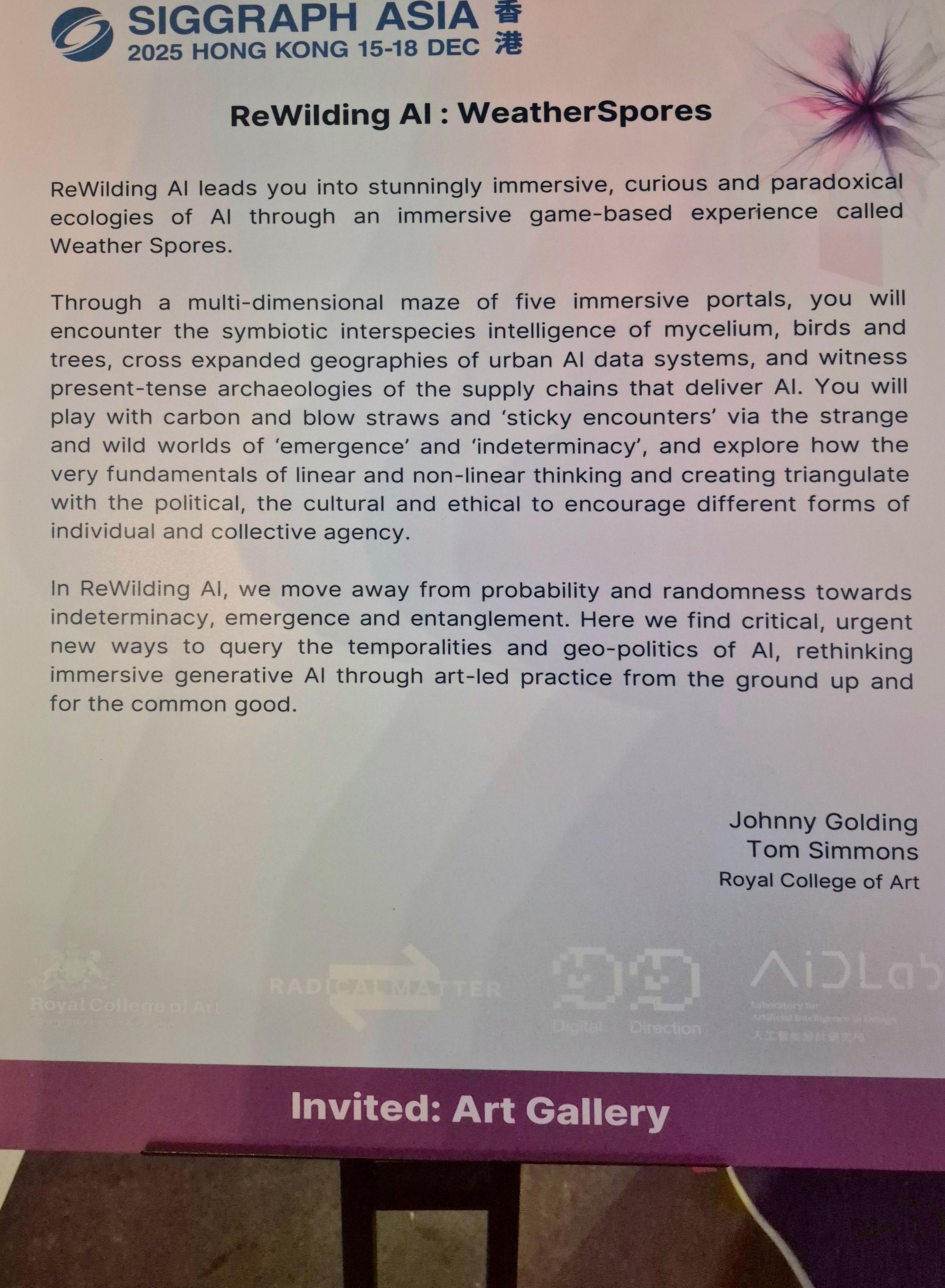 I visited SIGGRAPH ASIA on its second last day to catch "Weather spores" (WS, which is part of a larger program “ReWilding AI”) by an RCA team of artist-researchers I first met in March 2024 in "Ana-Cartography II / Real World Narratives" at Floating Projects (FP).